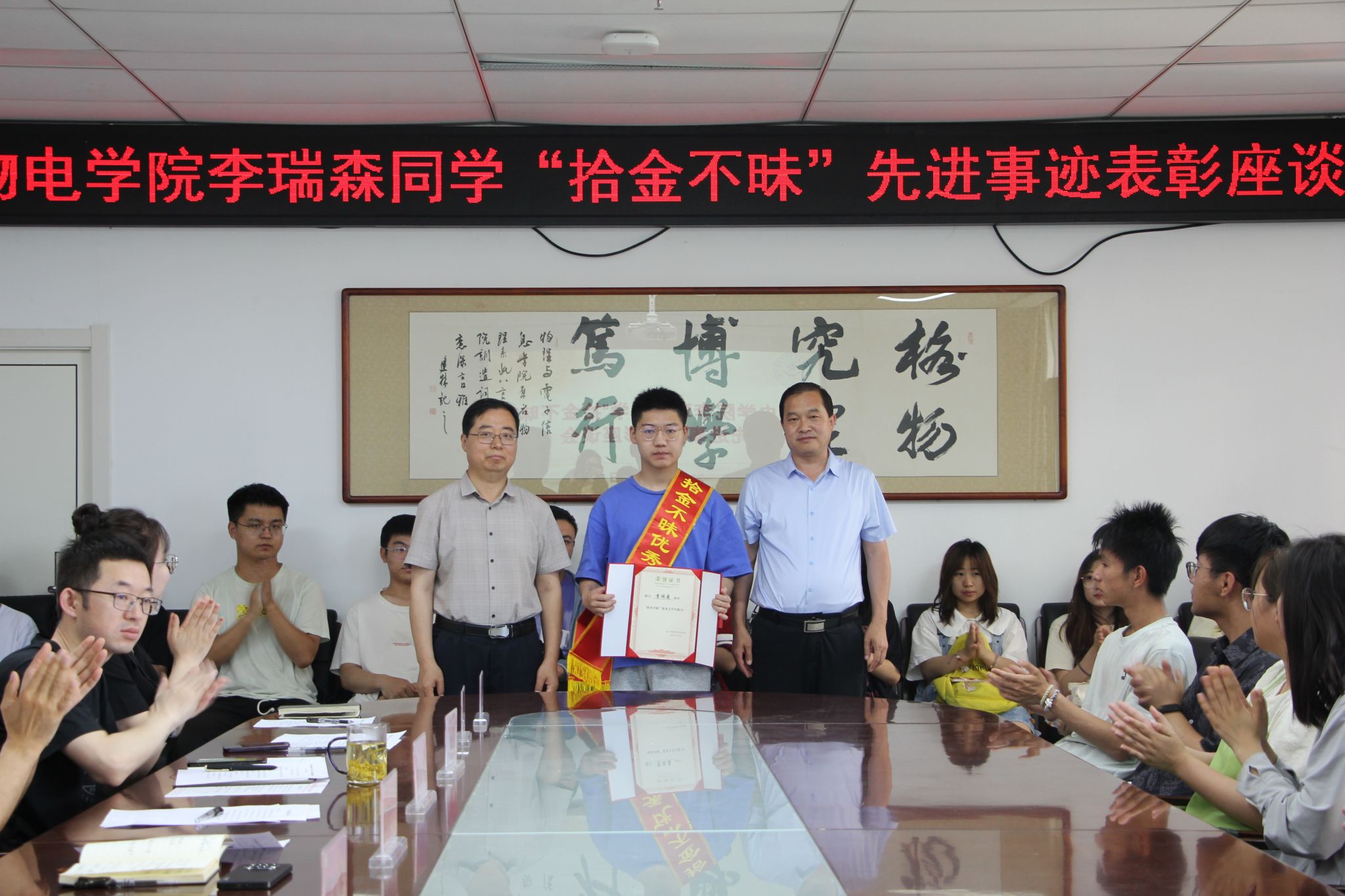 6月21日上午,公司在新城校区信息大厦A607会议室举行李瑞森同学“拾金不昧”先进事迹表彰座谈会。公司党委书记常胜伟,经理张富春,党委副书记肖金学,全体辅导员及各班党团骨干、积极分子、员工代表共60余人参加了座谈会。