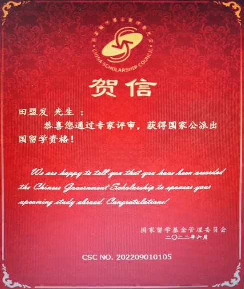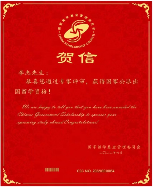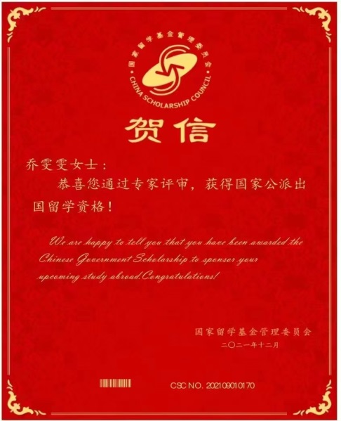 近日,国家留学基金管理委员会(CSC)公布“2022年赴俄乌白专业人才培养计划”名单,公司2020届推免硕士生田盟发、李杰及2021届推免硕士生郭昭、张健鹏、乔雯雯(2021年获得)共有5名推免硕士生获得国家公派出国留学资格。