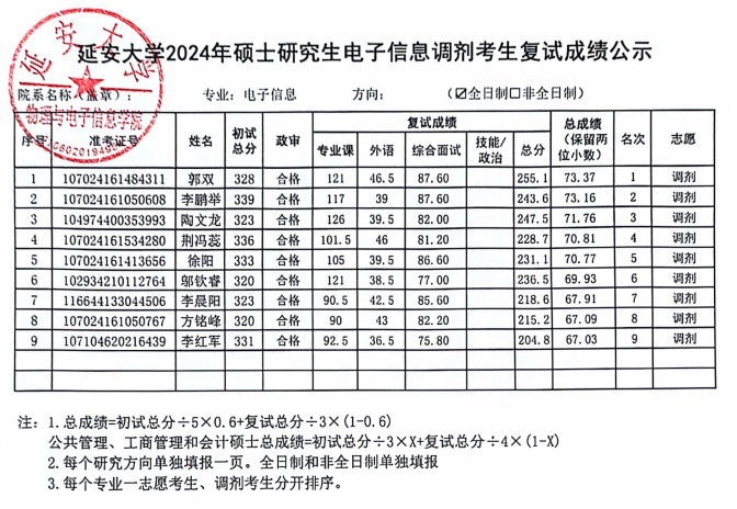 依照公司2024年硕士研究生复试工作实施方案,安排在2024年4月12日的电子信息调剂考生复试工作已经圆满结束,现将具体的复试成绩进行公示,公示时间为十个工作日。