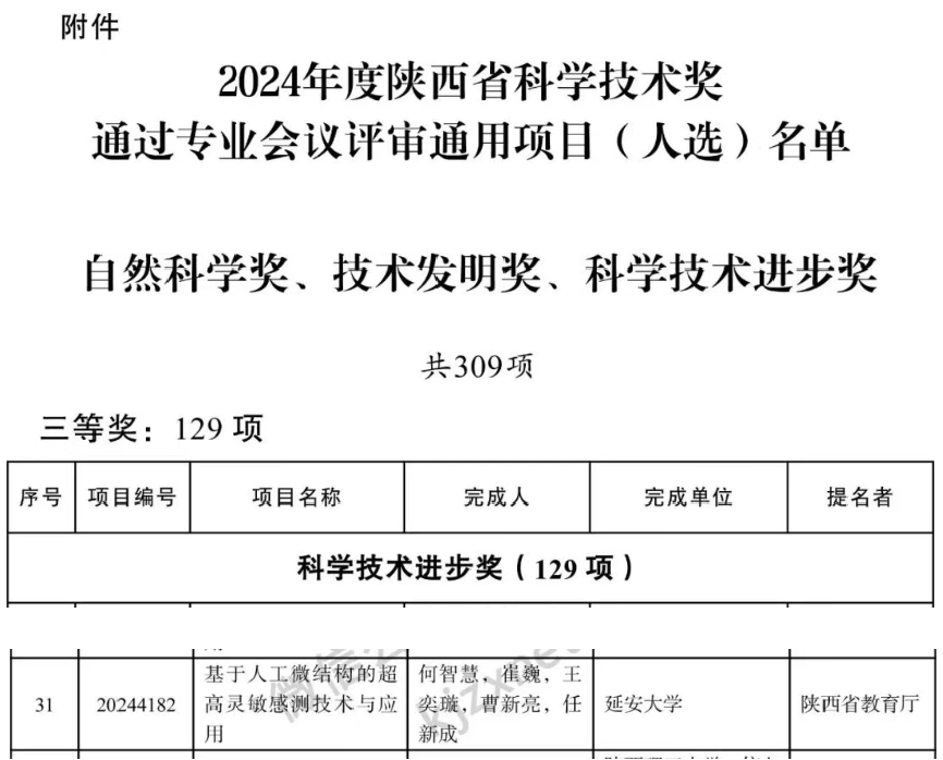 近日,陕西省科学技术奖励委员会工作办公室发布了《2024年度陕西省科学技术奖通过专业会议评审通用项目(人选)名单》,公司何智慧教授作为第一完成人、太阳成tyc122cc作为独立完成单位的成果“基于人工微结构的超高灵敏感测技术与应用”荣获陕西省科学技术进步三等奖,公司崔巍高级实验师、曹新亮教授、任新成教授作为主要完成人。